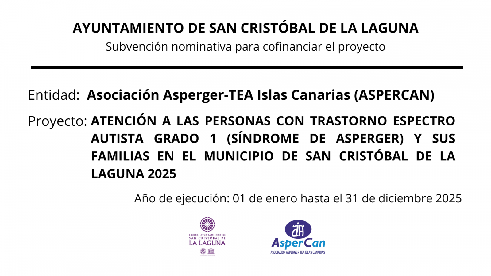 El Ayuntamiento de San Cristóbal de La Laguna cofinancia nuestro proyecto "Atención a las personas con Trastorno del Espectro Autista grado 1 (Síndrome de Asperger) y sus familias en el municipio de San Cristóbal de La Laguna".
